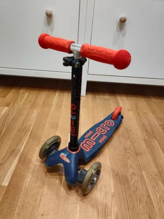 Patinete infantil de tres ruedas de la marca Micro. Es de color azul y perfecto para los más pequeños. - Tres ruedas para mayor estabilidad. - Manillar extraible para plegarlo facil - Plataforma antideslizante. - Esta andado como se aprecia en las fotos pero está repasado y funciona perfectamente.