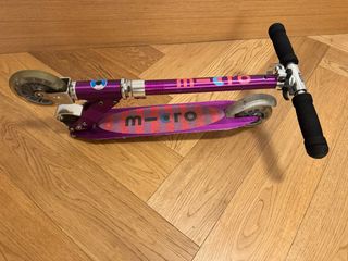 Patinete Micro Sprite en color lila con luces LED en las ruedas. Precio en tienda actual: 119,90 eur - Ruedas con luces LED. - Manillar ajustable. - Plataforma antideslizante.