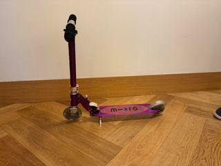 Patinete de la marca Micro en color morado. Ideal para desplazamientos urbanos. - Plataforma con diseño a rayas. - Ruedas con luces LED. - Manillar ajustable.