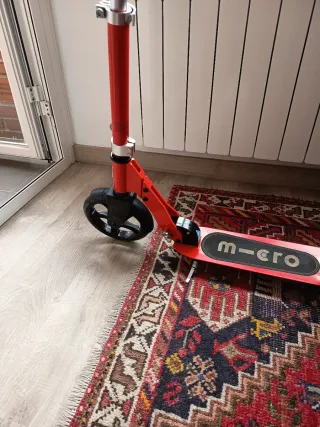 Patinete de la marca Micro en color rojo. - Diseño plegable. Con correa para transportarlo - Ruedas para desplazamiento. - Manillar ajustable. - en buen estado poco uso - Tiene alguna marca pero poco uso