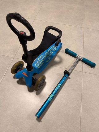 Patinete infantil Mini Micro 3in1 en color aqua. Se adapta al crecimiento del niño. - Incluye asiento.Y dos manillares. - Para edades de 1 a 5 años.