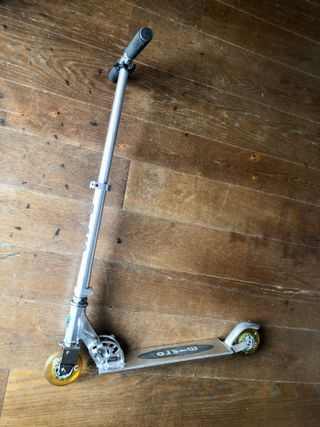 - Patinete infantil de aluminio marca "Micro" de color plateado. - De buena calidad y diseño suizo. - Soporta 90 kg. - Funciona perfectamente, aunque tiene señales de uso. - Manillar ajustable en altura, de 60 hasta 90 cm de altura desde el suelo. - Longitud total 66 cm. - Plataforma antideslizante con una superficie útil de apoyo de 33 por 10 cm. - Ruedas de goma de buena calidad de 10 cm de diámetro. - Freno trasero de buena calidad. - Doble cierre por seguridad. - Plegado ocupa muy poco. - Pesa poco. - Estoy dispuesto a cambiarlo por un monitor de ordenador de 27 pulgadas o por un patinete para adulto.
