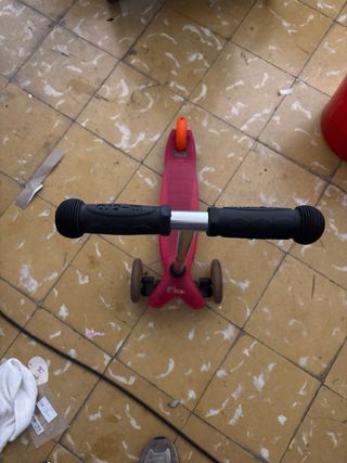 Patinete infantil de la marca Micro, modelo de tres ruedas. - Color rojo vibrante. - Plataforma antideslizante. - Ruedas negras de goma. - Habría que cambiar las manijas. Se consiguen por €8 en Amazon u originales por €16. - Aparte de eso el patinete está en muy buen estado como se ve en las fotos.