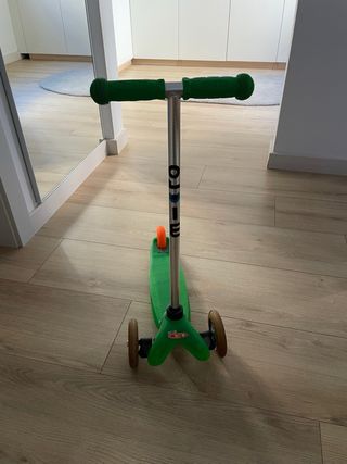 Patinete infantil Mini Micro en color verde, ideal para los más pequeños. - Tres ruedas para mayor estabilidad. - Puños de goma para un agarre cómodo. Muy buen estado - Plataforma de color verde. Bien estado, hay que limpiar - Ruedas delanteras grises. Trasera con freno naranja, sin deterioro