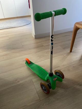 Patinete infantil Micro Mini de tres ruedas en color verde. - Diseño de tres ruedas para mayor estabilidad. - Manillar ajustable en altura. - Empuñaduras de goma para un agarre cómodo.