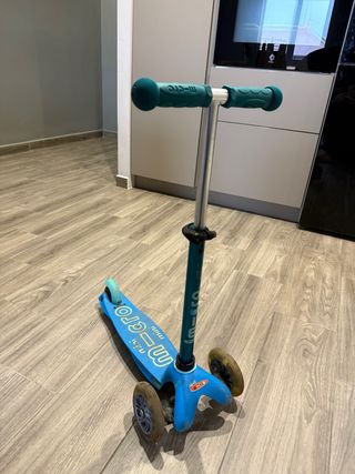 Patinete infantil de tres ruedas original de la marca Micro. Para niñ@s de 2-6 años. - Las ruedas delanteras se iluminan al rodar - Manillar ajustable - Tiene uno de los mangos de goma para cambiar. Los originales valen unos 12€, en aliexpress puedes encontar por menos de 1€.