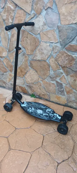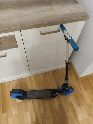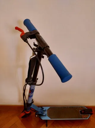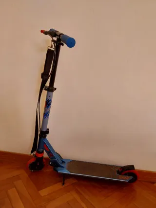Patinete de la marca Oxelo en color negro con detalles en azul. - Manillar con puños de goma. - Plataforma antideslizante. - Ruedas con llantas de color cobre. esta en perfecto estado el manillar un poco doblado pero funciona perfectamente