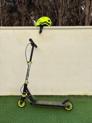 Patinete Oxelo en color verde lima y negro, diseñado para soportar hasta 100kg. - Manillar negro con puños ergonómicos. - Plataforma antideslizante. - Ruedas negras. Acepto cambio por algo de mi interés (consultar).
