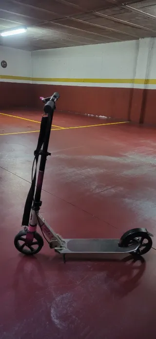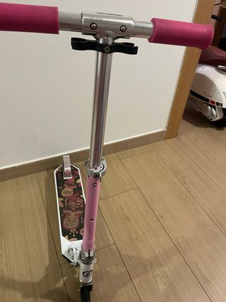 Patinete Oxelo de color rosa, ideal para desplazamientos urbanos. - Plataforma con diseño. - Ruedas blancas y negras. - Puños negros y rosa. -Lija nueva. -Pintado hace un mes.