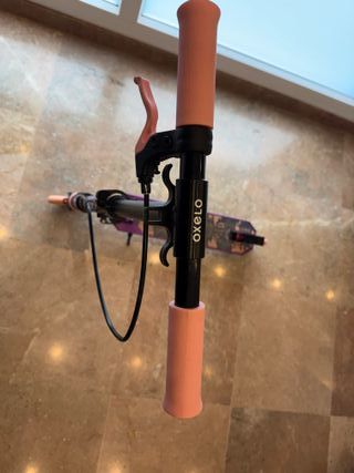 Patinete de la marca Oxelo con mangos de color rosa. - Manillar ajustable. - Plegable para facilitar su transporte.