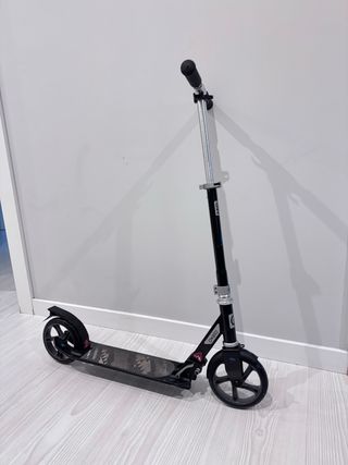 Patinete de 9 a 14 años que midan entre 1,25 m a 1,75m y pesen hasta 100 kg. Altura ajustable Suspensión delantera y ruedas grandes, con freno en el manillar Sistema de plegado rápido con doble seguridad. De fácil transporte, con la correa incluida y solo pesa 5 kg Se ha utilizado muy poco y está en muy buenas condiciones