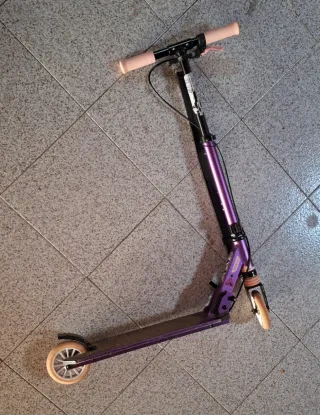 Patinete de la marca Oxelo en color morado. Muy nuevo con muy poco uso, ver las fotos. - Diseño con estampado. - Ruedas de color claro. - Puños de color rosa.