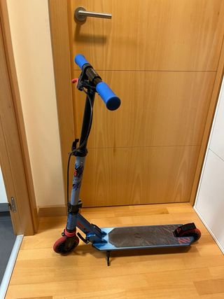 Patinete Oxelo de Decathlon en color azul. - Manillar con puños azules y rojos. - Ruedas delanteras rojas. - Plataforma con diseño gráfico. - Doble freno. - Ajustable manillar en altura. - Máximo 100kg.