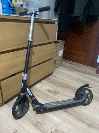 - Venta en persona. - Patinete Oxelo Mid9. Color negro y plata. - Manillar ajustable en altura. - Freno en manillar y en rueda trasera. - Puños de goma. - Ruedas grandes para mayor suavidad. -Plataforma ancha y cómoda con base antideslizante.