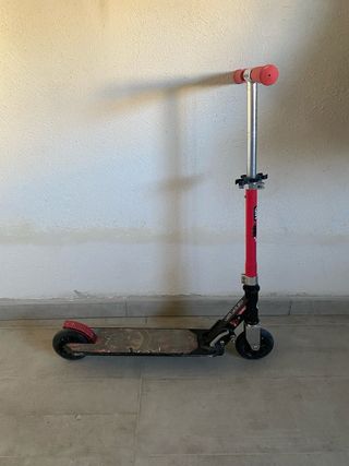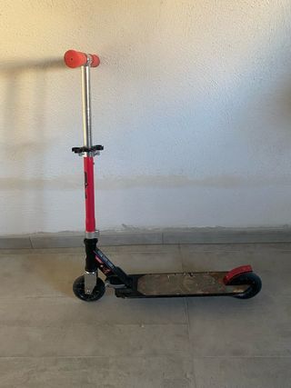Patinete de la marca Oxelo en color rojo. - Manillar negro con puños. - Plataforma roja. - Ruedas negras, muy poco uso En perfectas condiciones. Sin golpes, unica pequeña mella en el freno.