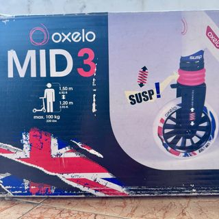 Patinete Oxelo MID 3 con suspensión semirígida delantera y freno trasero. Perfecto para niños y niñas de entre 6 y 10 años. Usado pero cuidado y limpio, funciona todo perfectamente y no le falta ninguna pieza. En su caja con su manual básico de instrucciones. - Plegable. - Tamaño ruedas 125mm. - Soporta hasta 60kg - Altura ajustable entre 1,20 m y 1,50 m. - Peso máximo soportado: 100 kg (220 lbs). - Diseño con bandera Union Jack.