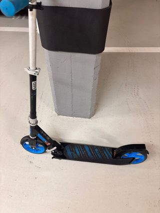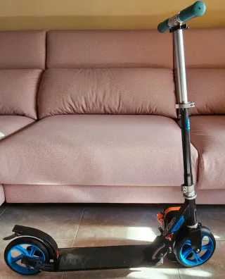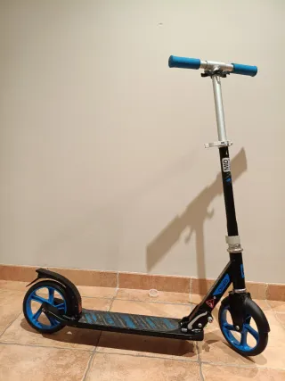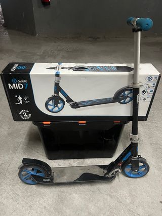 Patinete Oxelo MID5 en color azul. Se vende con su caja original. Tiene marcas de uso pero funciona perfectamente. - Manillar ajustable en altura. - Ruedas de 200mm. - Freno trasero. - Pata de cabra.