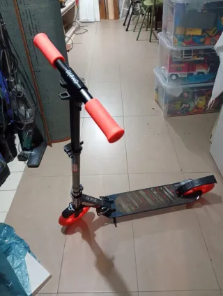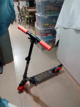 Patinete plegable Oxelo MID 9 de Decathlon, ideal para desplazamientos urbanos. Su diseño permite un fácil transporte y almacenamiento. - Manillar ajustable en altura. - Ruedas de 230 mm para mayor comodidad. - Freno trasero. - Plataforma ancha. - Color negro - Utilizado en ciudad por niño de 8 años. - Amortiguador y frenos en buen estado