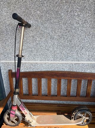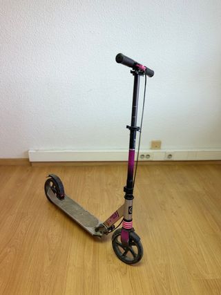 Patinete Oxelo Mid5 color morado y rosa en muy buen estado. - Manillar negro ajustable, con un pequeño defecto en un puño. (ver foto) - Freno trasero. Funciona perfectamente.