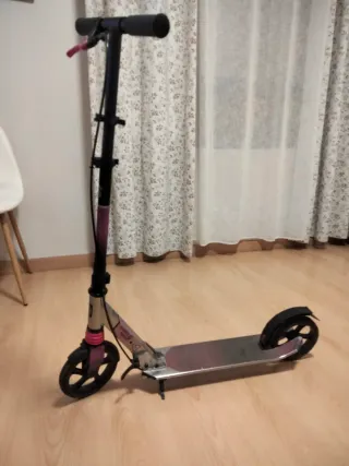 Patinete Oxelo MID 9 en color plateado y detalles en rosa y morado, para los adolescentes de 9 a 14 años! El patinete MID9 tiene suspensión delantera y ruedas grandes. El detalle: tiene un freno en el manillar para controlar mejor la velocidad - Manillar ajustable en altura. - Ruedas de 200 mm. - Freno trasero. - Plegable para facilitar su transporte. En perfecto estado, se vende a mitad de precio por no usar. A recoger en Badajoz.