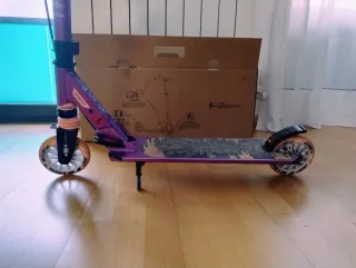 Patinete oxelo MID5 de color violeta, diseño para niños de 5 a 10 años, ideal para desplazamientos y diversión. - Plataforma amplia para mayor comodidad y antideslizante. - Ruedas de 120mm. - Manillar ajustable en altura Precio nuevos 70€ vendo por 25€.