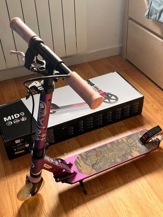 Patinete Oxelo MID 9 en color morado, con un diseño llamativo y en muy buen estado. - Puños de goma para un mejor agarre. - Plataforma con diseño gráfico. - Ruedas de goma. - Freno trasero.