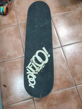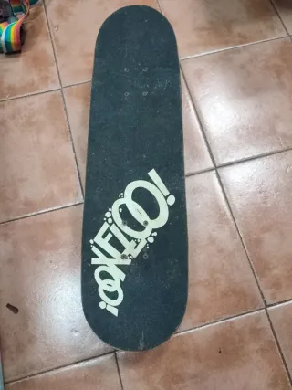 Monopatín o skate de Oxelo con un lobo en la parte de abajo que brilla en la oscuridad (última foto). Está muy bien cuidado, sobre todo la lija de arriba, pero tiene algunos signos del uso, el q tengo que destacar es los dientes del lobo, que están pintados ya que se me raspó (foto 3). La tabla mide: 80cm de largo y 20cm de ancho.