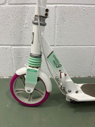 Patinete Oxelo MID5 en color rosa, diseñado para niños. Ideal para desplazamientos y diversión. - Manillar ajustable en altura. - Ruedas de 125 mm. - Freno trasero y delantero. - Plegable para facilitar su transporte. - Se ha usado, pero no mucho. No obstante, Decathlon sigue vendiendo recambios para el producto.