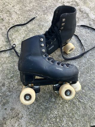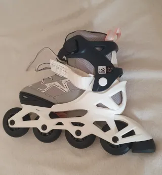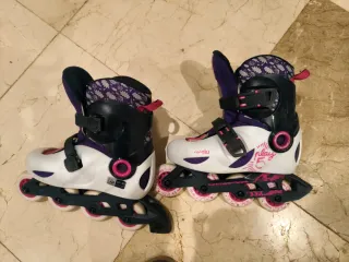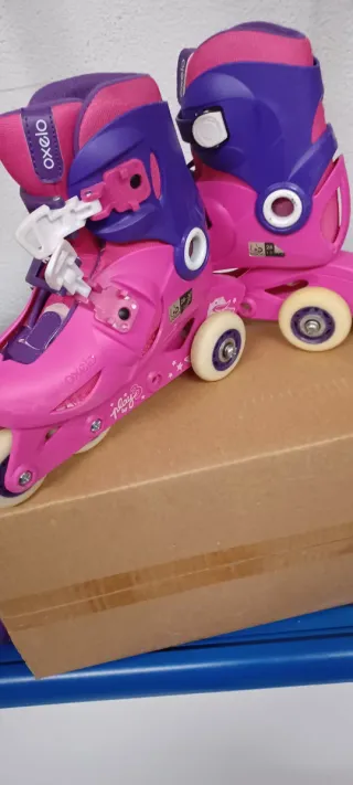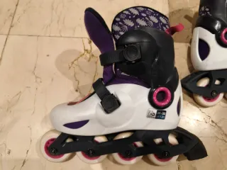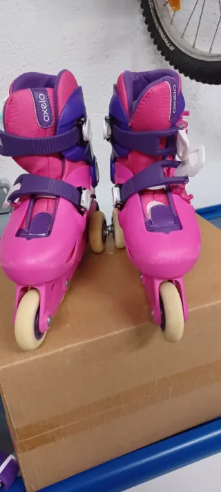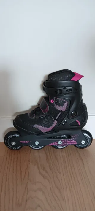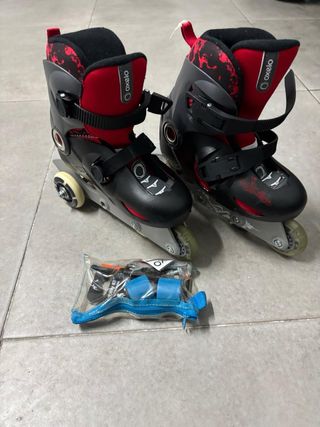 Patines en línea de la marca Oxelo de Decathlon. Son adaptativos y abarcan las tallas 26, 27 y 28. Las ruedas se pueden poner en línea o una delante y dos atrás (en paralelo) para ganar en estabilidad. Están bastante usados, pero todavía se pueden aprovechar. Vienen con protecciones y bolsa para transportarlos.