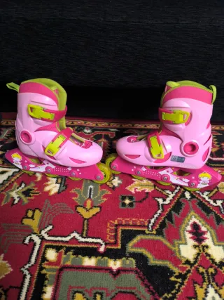 Patines en línea rosas de la marca Oxelo, ideales para niñas. Ajustables en talla. - Color: Rosa con detalles en verde lima. - Talla: Ajustable de 28 a 38. - Cierre: Hebilla y velcro para un ajuste seguro. - Diseño: Con dibujos infantiles en la bota.