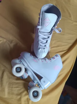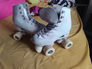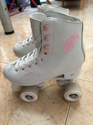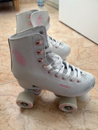 Patines de cuatro ruedas de la marca Oxelo, talla 35. - Color blanco con detalles en rosa. - Diseño con pluma en el lateral. - Cierre con cordones blancos. - Bolsa de transporte.