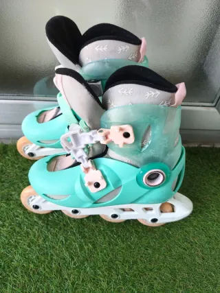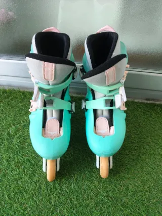Patines en línea de la marca Oxelo, ideales para iniciarse en el patinaje. - Talla ajustable 30-32. - Color verde menta y detalles en rosa. - Cierre de velcro y hebilla. - Ruedas de poliuretano.