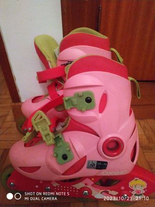 Patines en línea Oxelo para niña, talla 28-30. Están en buen estado y son ideales para principiantes. - Color rosa y verde. - Diseño con hadas. - Talla ajustable (28-30)