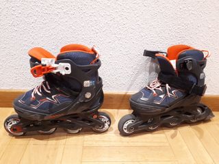 Patines en línea Oxelo para niños, en buen estado. Ideales para iniciarse en el patinaje. - Dos patines en línea Oxelo. - Talla ajustable 35 a 38 - Color negro y naranja.