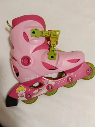 Patines en línea para niña de la marca Oxelo, ideales para iniciarse en el patinaje. - Talla ajustable de 26 a 28. - Diseño en color rosa. - Ruedas de color verde. - Poco uso, aunque algunas marcas de arañazos - Correas en perfecto estado de amarre