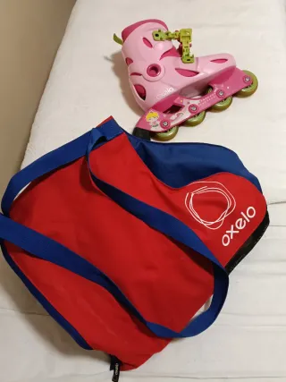 Patines en línea de color rosa, marca Oxelo, diseñados para niñas. Incluyen bolsa de transporte. - Talla ajustable: 34-36 EU. - Cierre con velcro y hebillas. - Ruedas de poliuretano. Regalo el casco y bolsa con coderas y rodilleras.