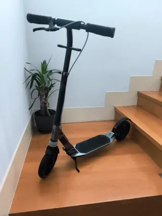 Patinete patin de grande de adultos Oxelo Town 7XL en color negro y gris. Diseñado para desplazamientos urbanos. Este patin, hoy, cuesta en Decathlon 115€. Tiene 2 Frenos (trasero y en el manillar). Ruedas de goma grandes (200mm) y con goma de alto rebote para un rodaje suave. Tiene amortiguación. - Plataforma larga 34cm y ancha 12cm para mayor comodidad. - Manillar ajustable en altura. Lo compre para mi hija pero apenas lo usa. Salvo algún arañazo no tiene apenas uso mas que por la urba que es plana y con suelo liso. Regalo la pata que la compré y nunca la puse. Jorge. Zona Montecarmelo.