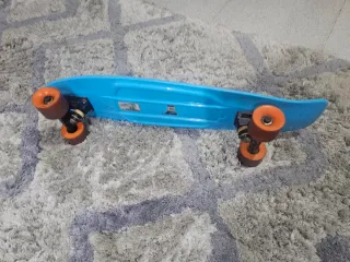 Monopatín de la marca Oxelo en color azul. - Diseño clásico. - Ruedas naranjas.