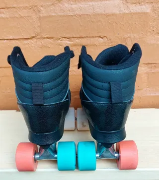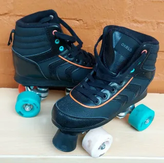 Se venden patines en línea de la marca Oxelo, en color negro y talla 38. Perfectos para iniciarse en el patinaje. - Diseño alto para mayor sujeción. - Cordones negros. - Detalles en naranja y turquesa. - Ruedas de color turquesa y una blanca.