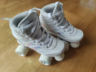 Patines de niña Oxelo en color blanco, talla 32. Han sido usados una sola vez. - Diseño alto tipo bota. - Ruedas blancas. - Cierre con cordones. - Detalles iridiscentes en los laterales.