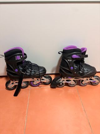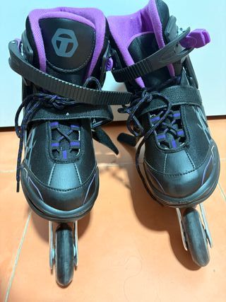 Patines en línea Oxelo para mujer, con ajuste de talla desde la 38 a la 41. Se han utilizado solo una vez. Como NUEVOS! - Talla ajustable de 38 a 41. - Diseño en color negro y morado. - Cierre con cordones y hebilla.