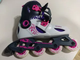 Patines en línea Oxelo Play 3 en color rosa y morado. - Talla 26 a 28 (16.5 a 18) - Los cierres funcionan correctamente - Las ruedas se pueden colocar en línea o con 2 detrás para mayor estabilidad. - Freno en buen estado, poco desgaste - Marcas propias del uso, sobre todo en las punteras.