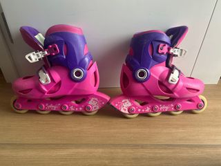 Patines infantiles de la marca Oxelo de Decathlon en color rosa y morado. - Cierre de velcro y hebilla. - Ruedas de poliuretano. - Diseño con dibujos infantiles. Son adaptables desde la talla 26 hasta la 28, tienen algunos roces de uso pero se pueden utilizar perfectamente.