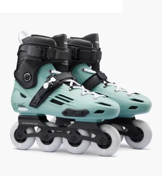 Patines en línea Oxelo para niña, ajustables en talla. - Color verde menta con detalles blancos y grises. - Cierre con velcro y hebilla. - Ruedas de color rosa.