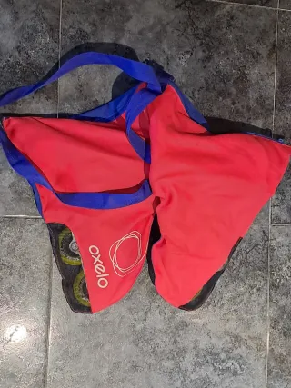 Bolsa para patines de la marca Oxelo. - Color rojo y azul. - Malla para ventilación. - Incluye correa para colgar. -TALLA DE 35 A 38 -Protecciones talla S -Se obsequio con un casco.