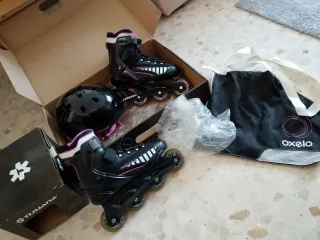 Conjunto de patines en línea y casco de protección. - Patines talla 40-41. - Casco negro talla M regulable - Bolsa de transporte Oxelo incluida. Cási sin uso...usado una vez, o ninguna, comprado en el Corte inglés....gracias!!!