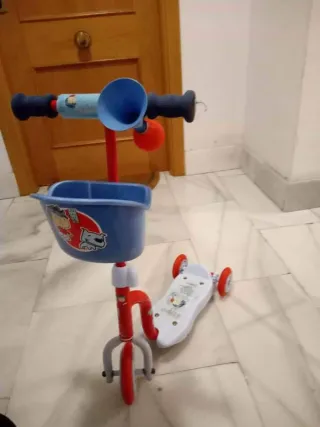 Patinete infantil azul en buen estado. Ideal para niños y niñas. - Tres ruedas para mayor estabilidad. - Color azul y detalles amarillos. - Manillar regulable en 3 alturas. - Marca Decathlon Oxelo.