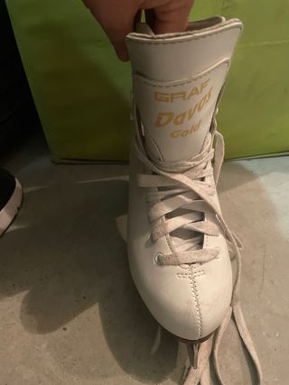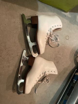 Par de patines de hielo blancos, perfectos para patinaje artístico. - Diseño clásico y elegante. - Cierre con cordones para un ajuste seguro. - Cuchillas de metal resistentes.
