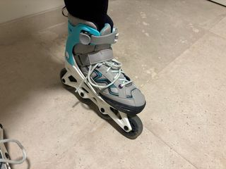 Patines en línea Oxelo con ajuste de talla. - Talla ajustable de 32 a 35. - Diseño en color gris y turquesa. - Cierre de velcro y hebilla.