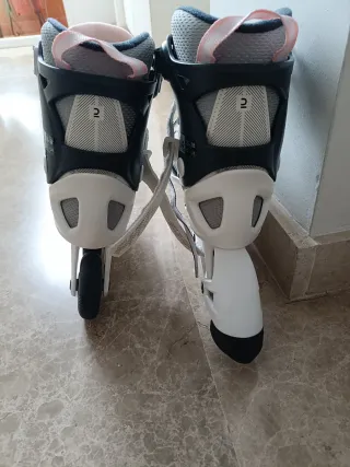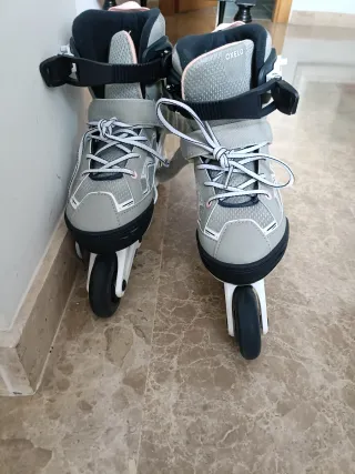 Patines en línea decathlon ajustables. - Talla ajustable de 35 a 38. - Diseño en color gris con detalles en rosa y negro. - Cierre con cordones, velcro y hebilla.